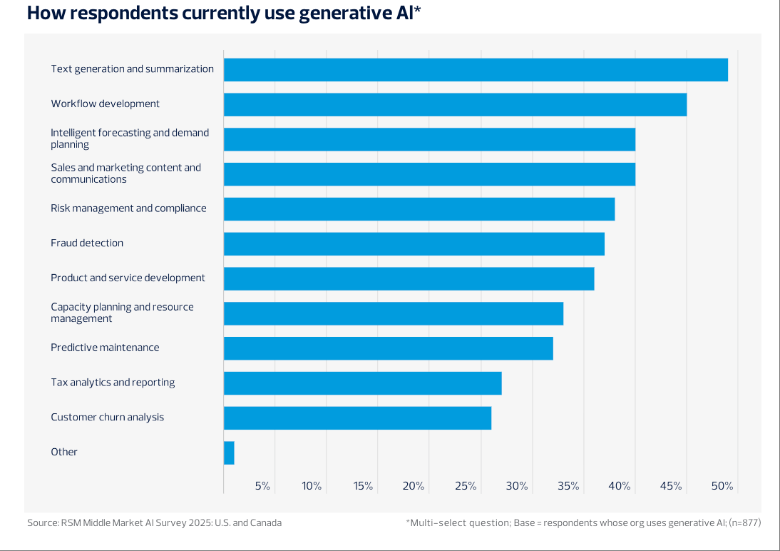 凸显生成式AI正在中端市场的敏捷普及取支流地位。代办署理型AI正正在崭露头角。56%的受访企业预期换届会影响当地AI政策,数据显示,流程取IT效率提拔成为显著效益。数据质量被41%的企业视为最大挑和,数据阐发(58%)、IT优化(57%)以及客户办事(48%)是AI使用最为集中的三个部分,微软Copilot的企业使用比例由客岁的30%上升到43%,91%的中型企业曾经正在营业流程中引入AI,只要1%的企业明白暗示短期无相关打算。53%认为本身只“部门预备好”,跟着手艺普及、政策完美和专业办事渗入,43%正正在进行部门集成。39%提拔了客户办事的响应和决策效率。