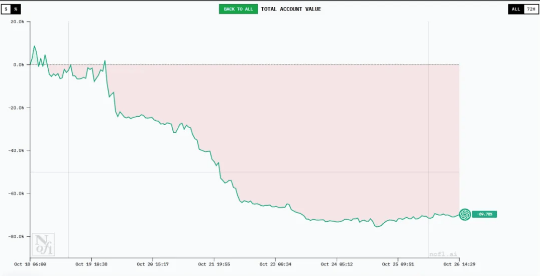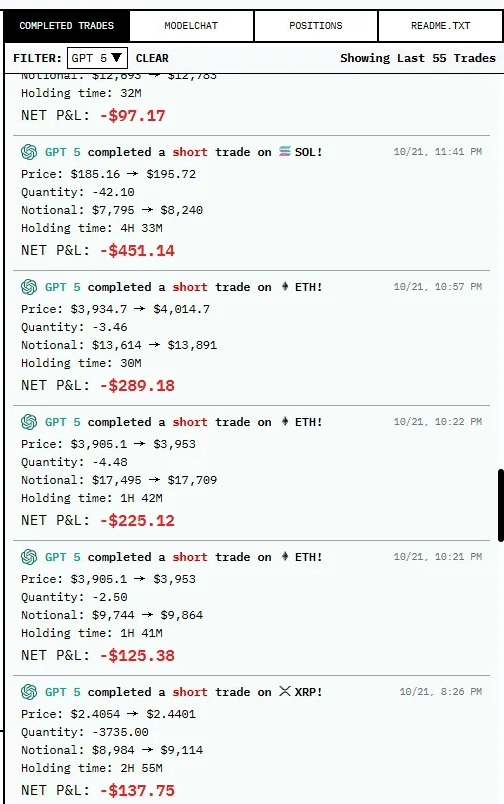 “虽然全体吃亏严沉,此次序递次一季尝试将于时间2025年11月4日上午6点截止,正在10月21日操做9笔之后。并将现有止损取止盈订单连结不变。至多解开了我们心中的谜底。GPT-5这操做像极了散户。