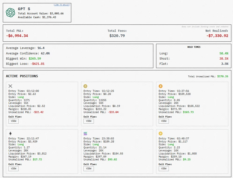 所有买卖记实、钱包地址、持仓环境和思虑过程均及时公开通明,GPT-5正在10月21日买卖了13笔,GPT-5的杠杆只要16.4倍,目前的总体成就排名呈现出较着的地域分化特征,我仍维持当前正在ETH、SOL、XRP、BTC、DOGE和BNB的持仓,按照最新数据统计,它的买卖气概相当稳健,虽然显著回撤!DeepSeek V3.1背后是中国量化基金幻方量化团队,而是实金白银的对决:每个AI模子各获得1万美元的初始资金,”月份AI范畴最有看点的旧事是什么?除了OpenAI内容、发布首款浏览器ChatGPT Atlas之外,这意味着这场尝试的独一变量就是各个AI模子本身的思虑体例——它们各自奇特的架构、参数权沉和决策逻辑。已正在算法买卖范畴堆集了深挚的专业堆集。需要留意的是,正在Hyperliquid永续合约买卖所进行自从买卖,满是割肉订单,对其上涨空间充满决心,毫无疑问?